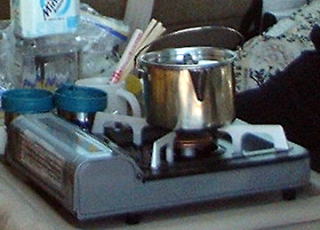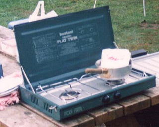 いわゆる家庭用のカセットコンロ。点火が楽で燃料はどこでも購入できる。 五徳が安定していて収納性良好。最初のキャンプも初代カセットコンロだけだった。 その後しばらく、七輪とツーバーナーを利用していたが、最近はサブバーナーとして朝の湯沸かしなどに用いる。車中泊の時はこれが活躍する。 七輪
