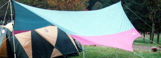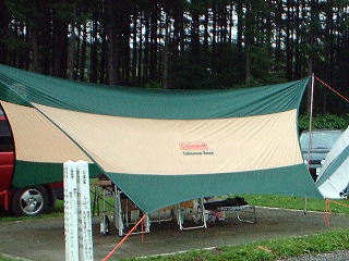 その色合いの美しさは最高。性能も最高峰。 見るたびにほれぼれしてしまう逸品。前述の山岳用カラーロープで更におしゃれにしてみました。 これにコールマンの赤ランタンがあればなぁー♪ タープの性格上、雨にも風にも弱い。 天気の良い日の日よけ目的の時と、連泊時のテントとスクリーンテントの連結用に使用。 |